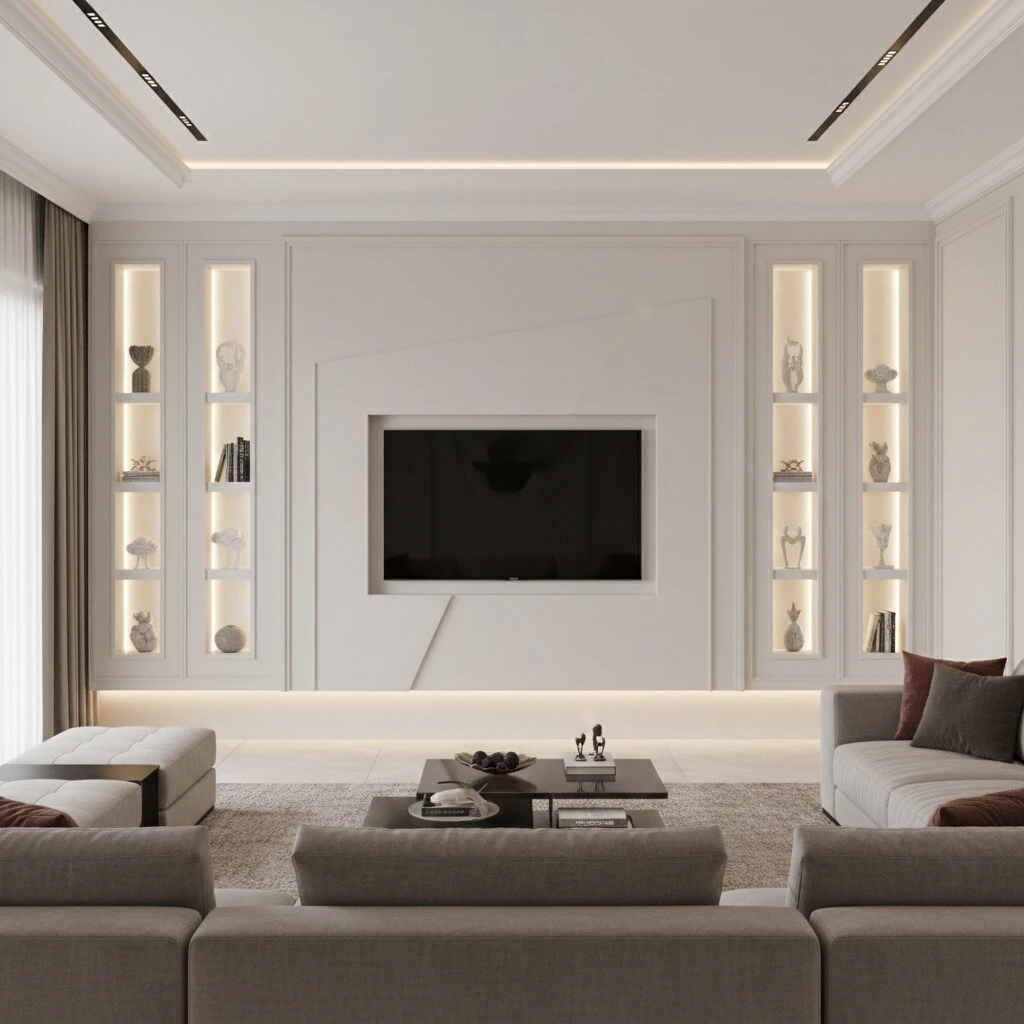 Izrada namenskih obloga za TV zidove, ugradnih niša i polica. Formiramo reljefne površine i 3D obloge od gipsa prema projektu. Ovi radovi zahtevaju preciznu potkonstrukciju i završnu obradu.